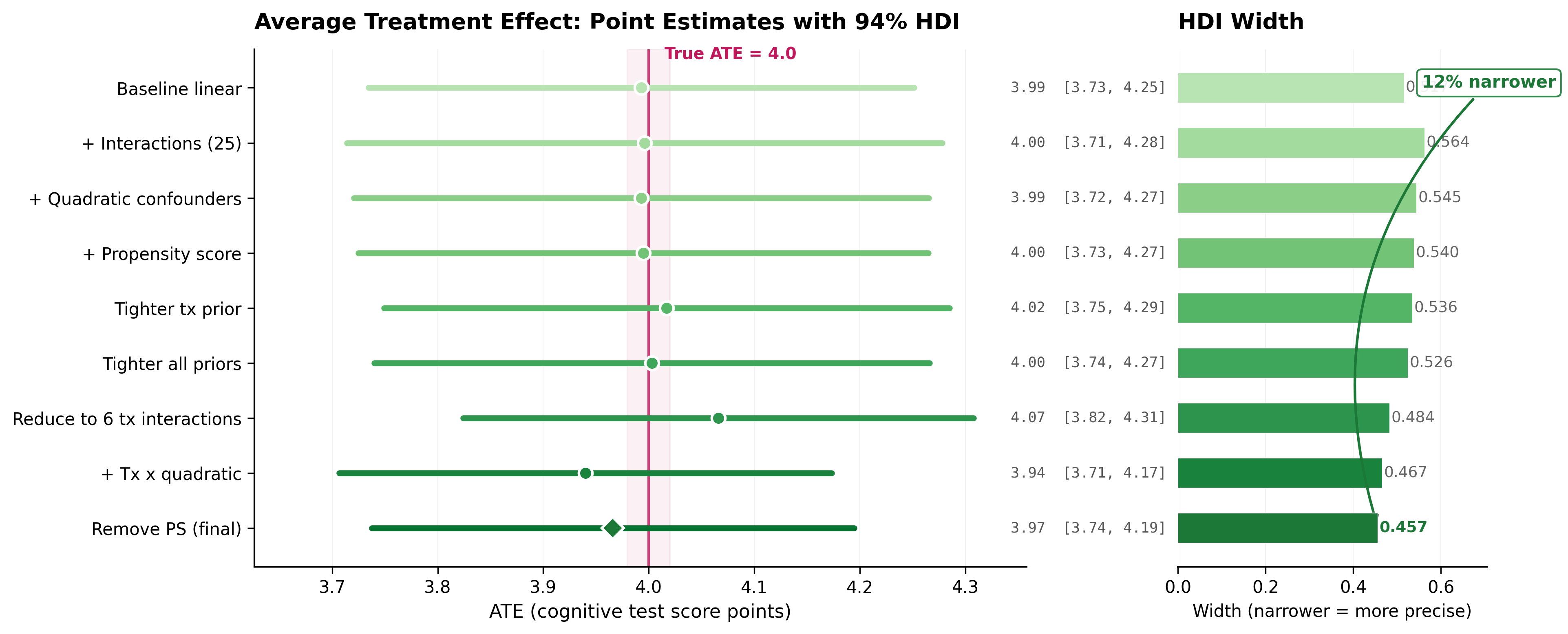Every model’s ATE estimate sits close to the true value of 4.0, and every credible interval contains it. But the intervals get tighter as the models improve, from 0.517 down to 0.457 (12% narrower).