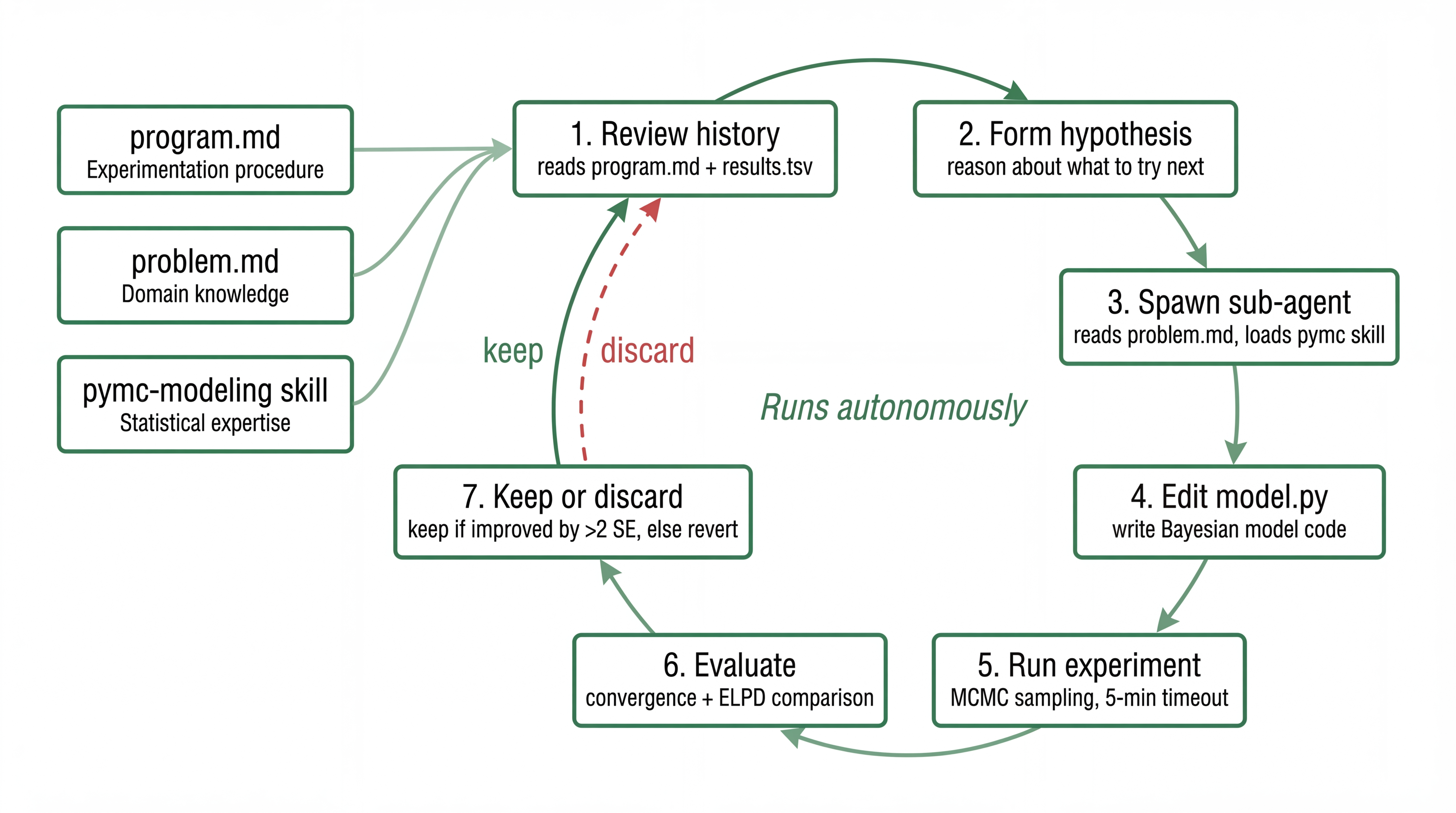 The coding sub-agent gets a fresh context each iteration. It reads PROBLEM.md, the current model, and the experiment history, then edits a single file (model.py). It loads a pymc-modeling skill that gives it statistical modeling expertise: when non-centered parameterizations help, how priors interact with sample size, what diagnostic values mean. The agent isn’t a generic coder. It’s a coder with a statistics textbook in working memory, reading a problem brief written by the domain expert.