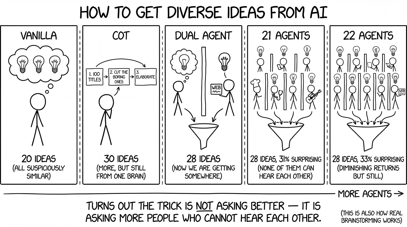 I ran 25 experiments on AI brainstorming. More agents beat better prompts.